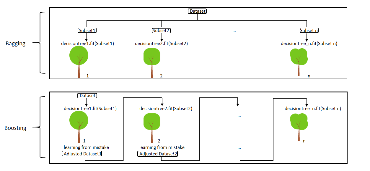 오늘 소개할 주제는 앙상블 기법(ensemble methods)1입니다. 앙상블 기법은 지도학습(supervised learning)의 대표적 기법중 하나로 여러 모형을 기반으로 예측을 결합하여 최종 결과를 내는 모형이라 할 수 있습니다. 이번 글에서는 Stacking을 제외한 가장 인기있는 대표적 앙상블 기법인 배깅(bagging)과 부스팅(boosting)을 기반으로 한 알고리즘들을 소개해보려고 해요. 수식은 최대한 배제하고 간략한 아이디어를 제공하기 위해 노력해보겠습니다.😃 다음은 배깅과 부스팅에 대한 간략한 개념 설명입니다: