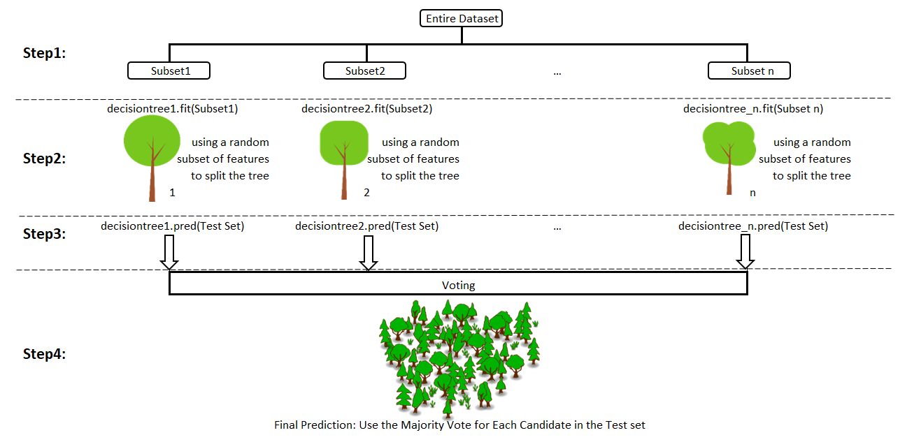 위 그림은 분류(classification) 문제에 대해 설명한 그림에 해당하며, 랜덤포레스트는 분류와 회귀 모두 해결할 수 있는 모형에 해당합니다. 또한 그림 2의 Step 1에서 말하는 Subset 1~Subset n을 원 자료의 붓스트랩 샘플이라고 생각하시면 됩니다.
