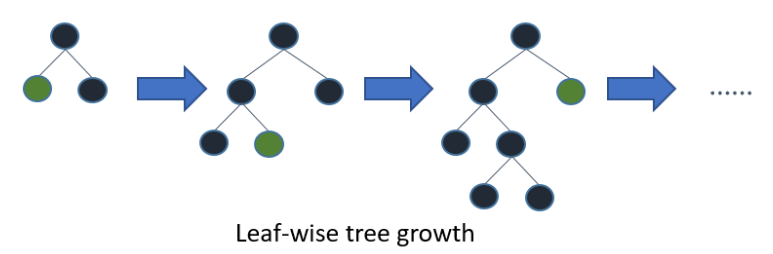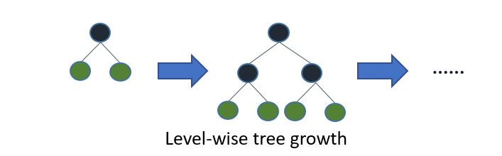 Light GBM의 모티베이션은 XGBoost의 긴 학습 시간이라 할 수 있습니다. XGBoost보다 학습 시간이 짧음에도 Light GBM은 그와 비슷한 성능을 내거나 조금 더 나은 성능을 보이는 경우도 때때로 있습니다. Light GBM의 트리성장은 앞서 다루었던 트리기반 알고리즘들과는 조금 다르게 진행됩니다. 앞서 다루었던 트리기반 알고리즘들은 트리를 성장시킬 때 level-wise(또는 depth-wise) 알고리즘을 이용하는 반면, Light GBM은 leaf-wise 알고리즘을 이용합니다: