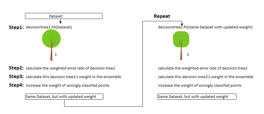 - Step 2, 3: 학습 시킨 트리의 가중 오차율(weighted error rates, $\varepsilon$) 계산. 즉, 여기서 $\varepsilon$은 해당 트리가 얼마나 많은 예측을 잘못 수행했는지를 나타냄